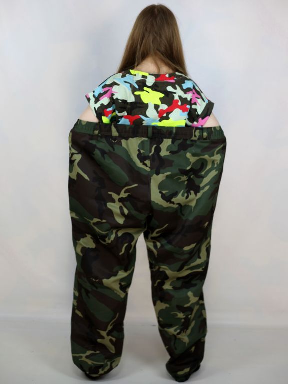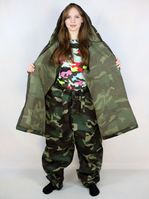 Куртка этого костюма застегивается на молнию и оснащена четырьмя накладными карманами: двумя нагрудными с клапаном и двумя боковыми. Рукава имеют широкие манжеты, а реглановый крой не сковывает движений, что гарантирует полную свободу действий. Эта куртка обеспечивает комфорт даже для крупных мужчин и женщин, хорошо сидит и выглядит опрятно, а плечи не создают чрезмерного объема. Брюки имеют высокую посадку и оснащены двумя боковыми карманами. Пояс выполнен на широкой резинке с шлевками и дополнительной утяжкой, что обеспечивает удобную подгонку по фигуре, а низ штанин заканчивается резинками.