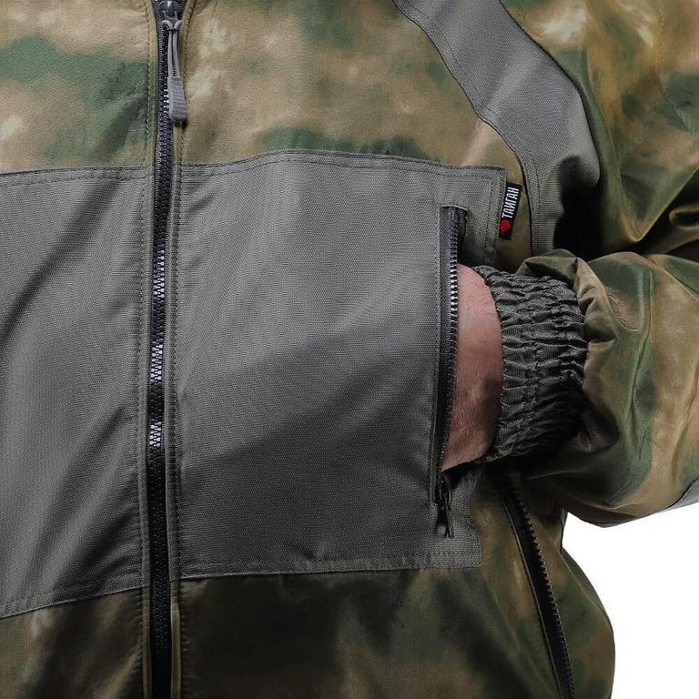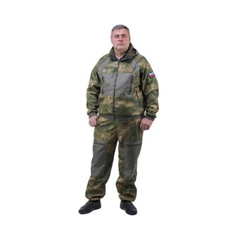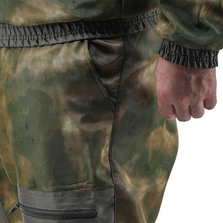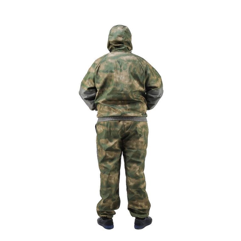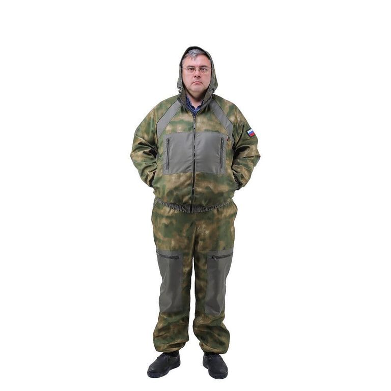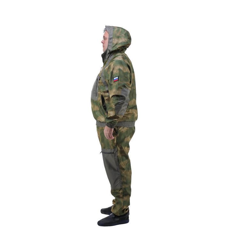 Рекомендован для рыболовов и охотников. Куртка укороченная на резинке, нагрудные карманы накладные на молнии, нижние карманы прорезные. Манжеты и низ куртки на резинке. Брюки прямые. На поясе шлевки под широкий ремень. Гульфик обработан на тесьму - молнию. Низ брюк регулируется. Костюм можно охарактеризовать, как "непромокаемый" и "дышащий" и поэтому он прекрасно подойдет для рыбалки.