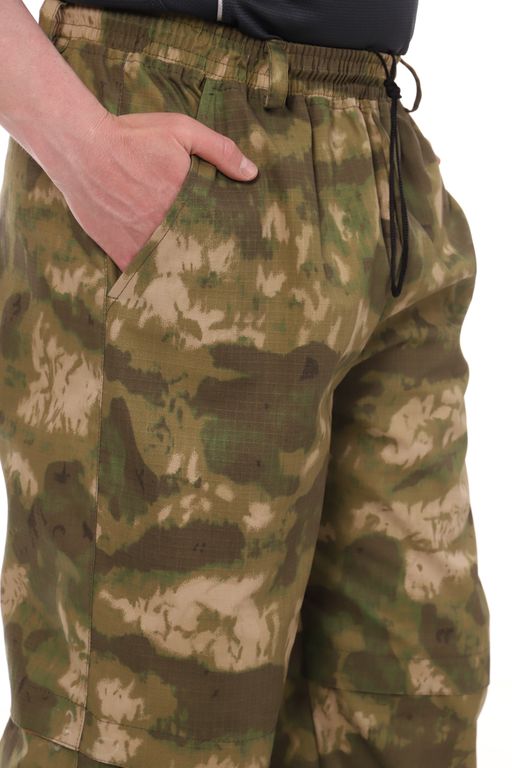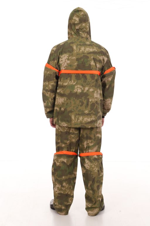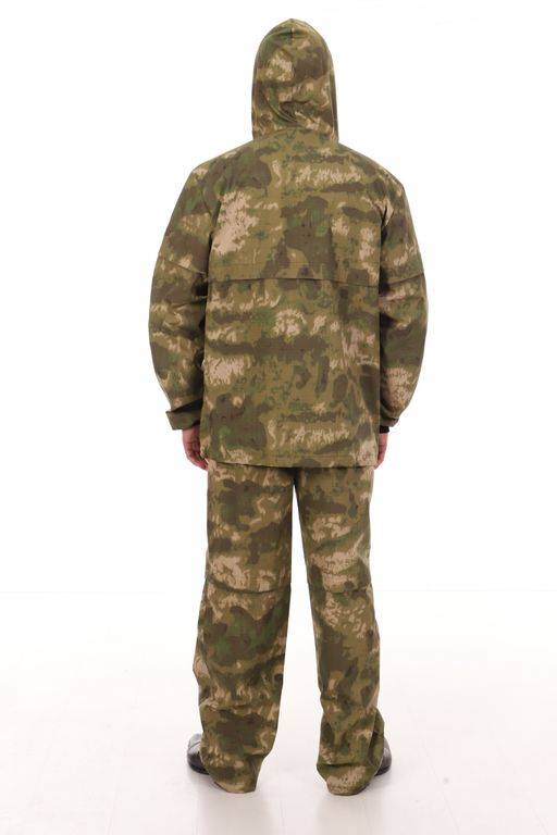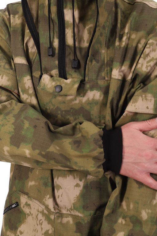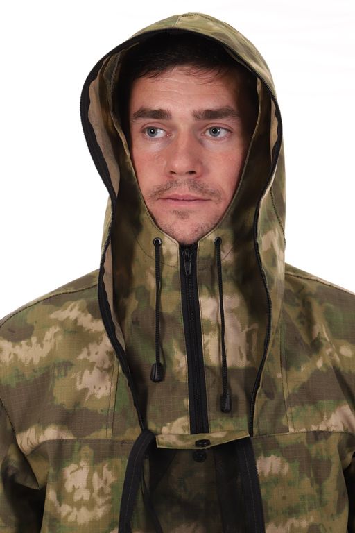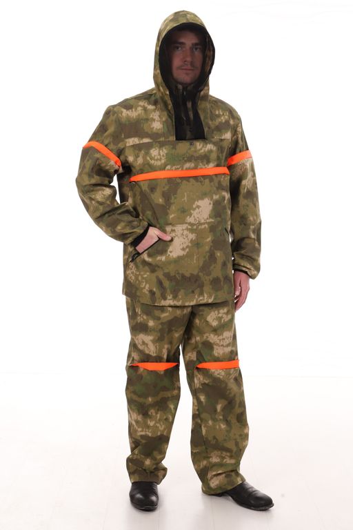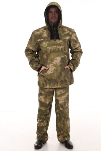 Костюм антимоскитный с ловушками (противоэнцефалитный) Антигнус, выполнен из смесовой ткани с усиливающей нитью рип-стоп камуфляжной расцветки - А-такс (A-Tacs) зеленый мох. Куртка выполнена свободного кроя. Куртка одевается через голову. На куртке имеются два нижних кармана с застежкой на молнию и один нагрудный карман под сетку с застежкой на кнопку. Низ куртки и низ брюк утягиваются резинкой с фиксатором. На рукавах куртки имеются трикотажные манжеты. На капюшоне имеется защитная сетка на лицо, которую можно отстегнуть и убрать в специальный карман. На куртке и брюках имеются специальные манжеты (подвороты) - ловушки от клещей, с яркой вставкой на внутренней стороне. Брюки на резинке, утягиваются шнуром, имеют два прорезных кармана на бедрах.