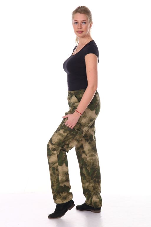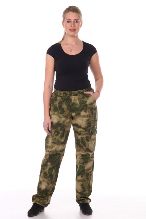 Брюки в поясе на резинке, низ брючин регулируется резинкой с фиксаторами. На брюках имеются четыре кармана: два прорезных на бедрах и два накладных кармана чуть выше колена с клапаном и с застежкой на кнопку.