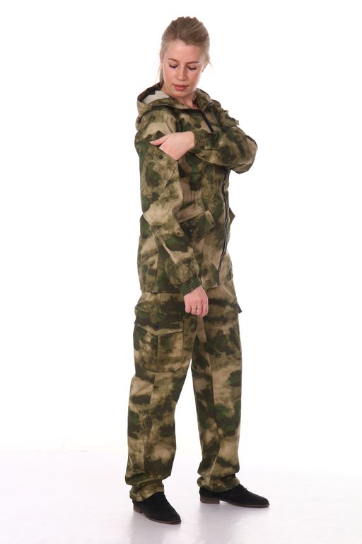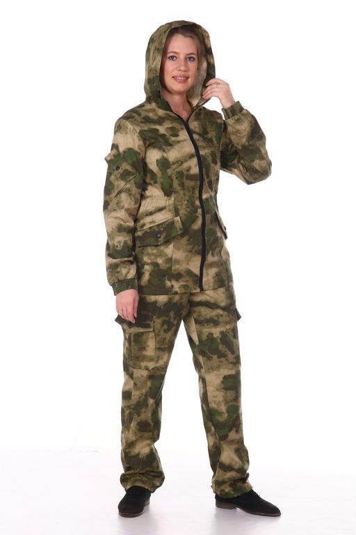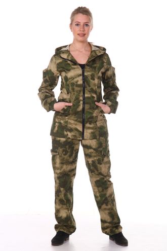Костюм летний женский Амазонка выполнен из ткани - 100% хлопок. Костюм имеет камуфляжную расцветку - зеленый A-Tacs. Комплект одежды состоит из куртки и брюк.