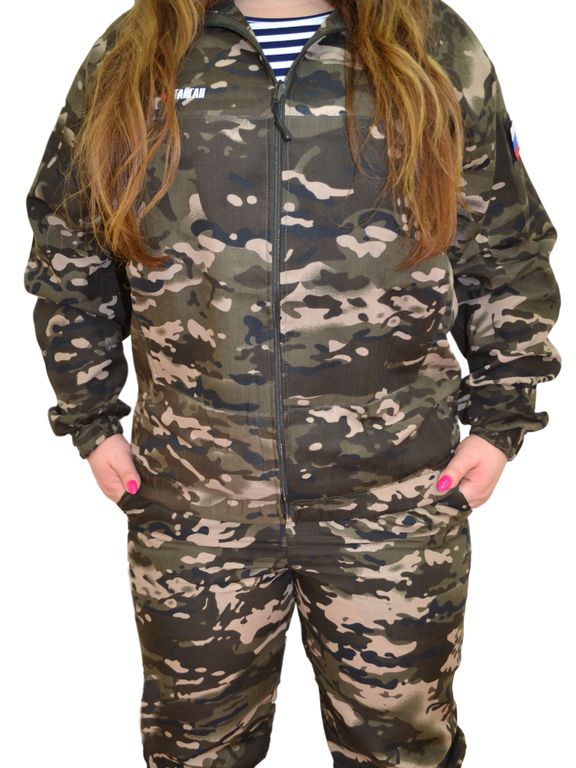 Костюм выполнен из сорочечной ткани премиум класса, которая обеспечивает повышенную воздухо- и паропроницаемость, что позволяет находиться на палящем солнце, кроме того она не шуршит при сминании, имеет высокие прочностные показатели, приятна к телу.