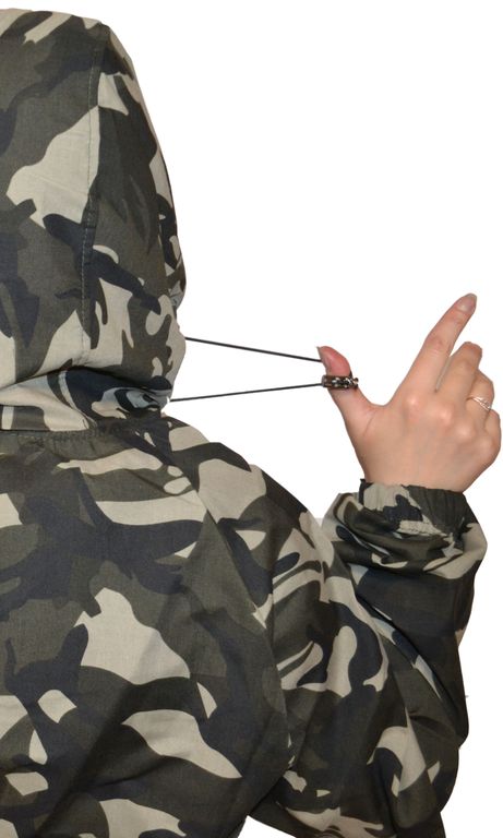 Куртка костюма укороченная на эластичном поясе, с застежкой на молнии, воротник стойка плавно переходит в капюшон, который регулируется фиксаторами, спереди два кармана на молнии, один внутренний карман, рукава по низу плотно облегают запястья за счет эластичной тесьмы.