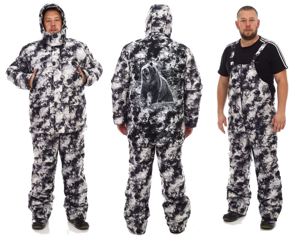 Зимний мужской костюм Медведь из мембранной ткани 5000/5000 с рисунком медведя на спине, камуфляжной белой расцветки. Утеплитель Слайтекс®, в куртке плотность 350 гр./кв.м., в полукомбинезоне 200 гр./кв.м., подкладка на флисе. Мембранная ткань не шуршит, бархатистая на ощупь, может использоваться как рыболовный костюм, так и для охоты.